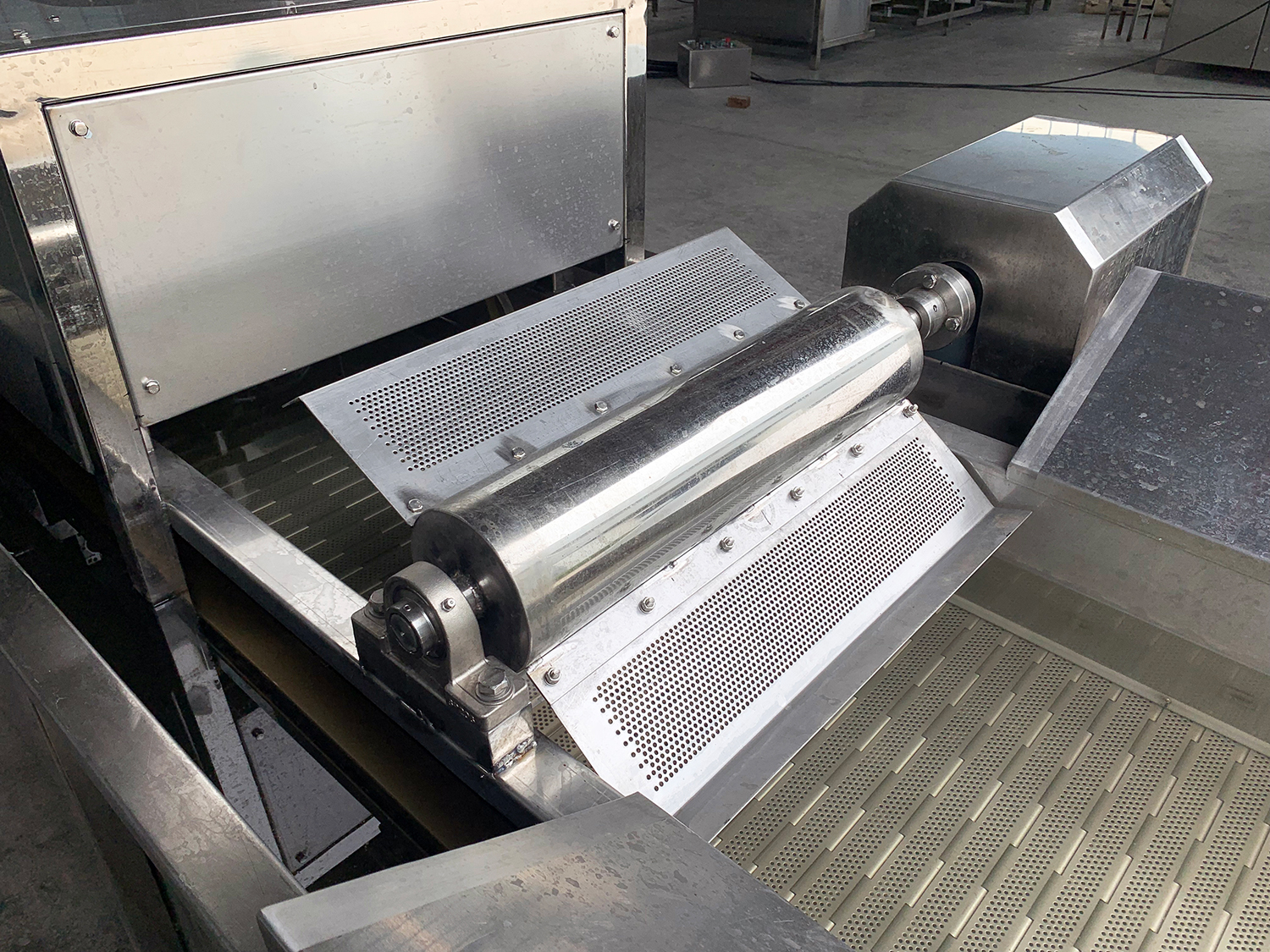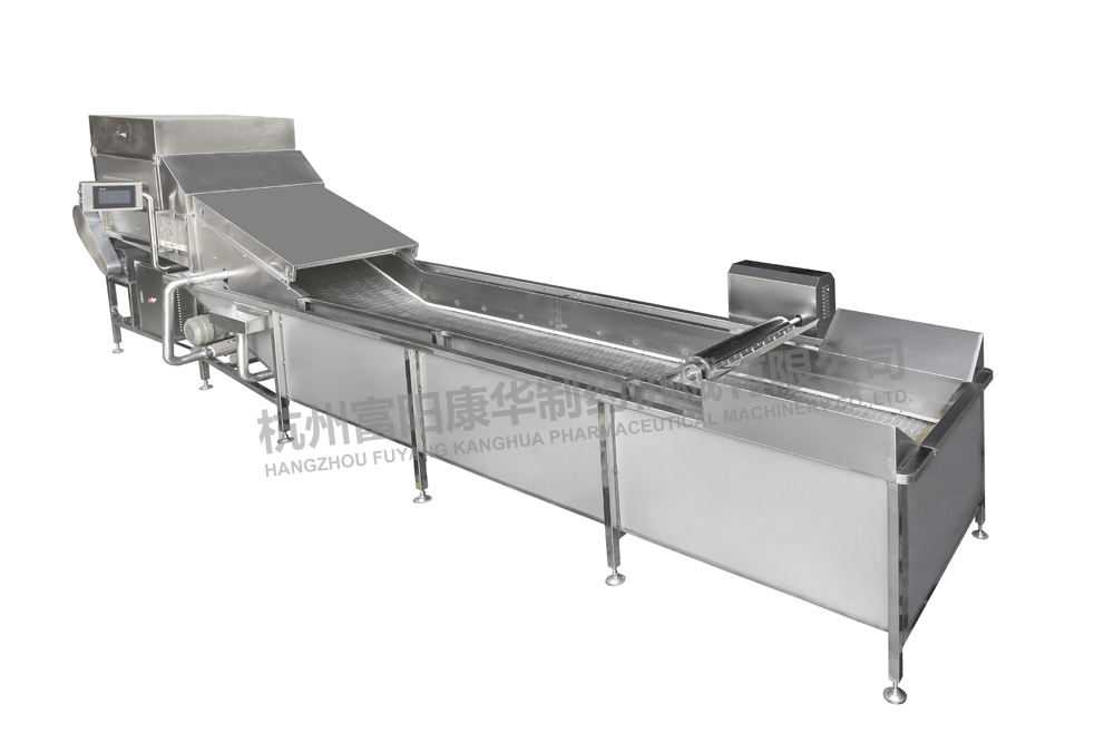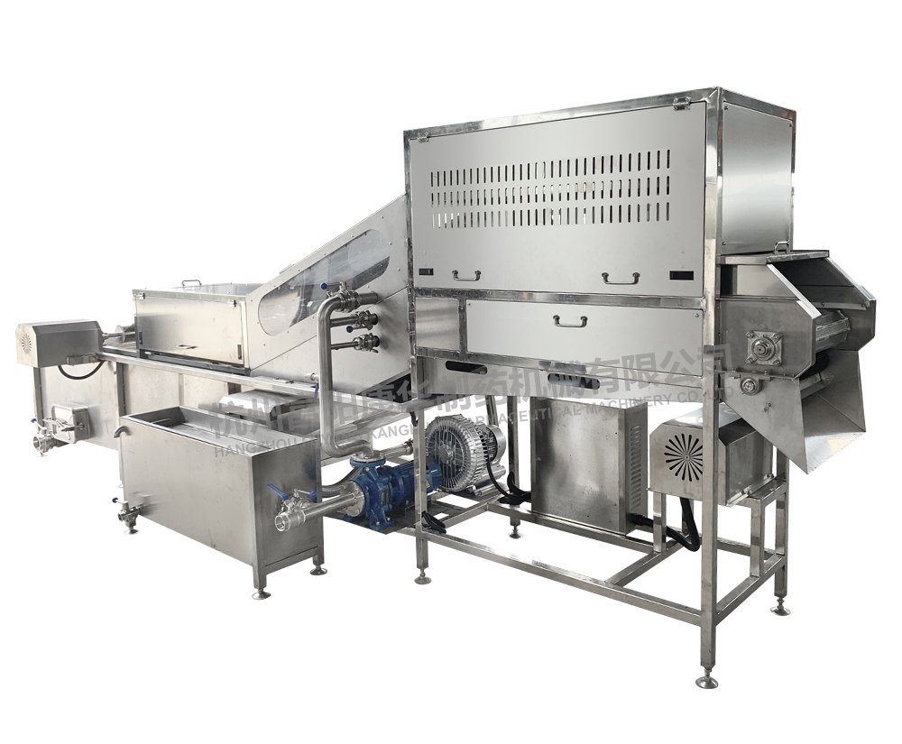 物料在網鏈輸送上運動同時,純凈的高壓空氣在清洗槽的網鏈下產生強烈氣水泡,形成水浪,從而達到對中草藥等物料充分進行清洗的目的。配套去雜去蟲機構,使漂浮物等隨水流從設備兩側流入到過濾網上,同時在物料輸出時在網鏈上方設有噴淋管,對物料進行沖洗,可用作雙重清洗。